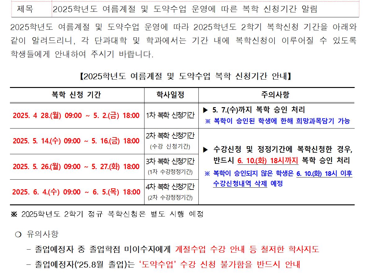 fnctId=bbs,fnctNo=2818 작성일 2025.04.18 수정일 2025.04.18 작성자 수학과 조회수 52 2025학년도 여름계절 및 도약수업 운영에 따른 복학 신청기간 알림 첨부파일 2025학년도 여름계절 및 도약수업 수강대상자 복학 신청기간 안내.pdf 미리보기