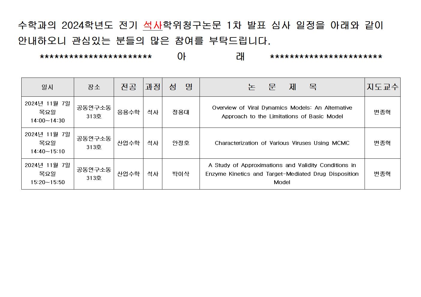 fnctId=bbs,fnctNo=3971 date 2024.10.30 modification day 2024.10.30 author 수학과 hits 33 2024학년도 전기 수학과 석사 학위청구논문 1차 발표 심사 일정 안내 file 2024학년도 전기 수학과 석사 학위청구논문 1차 발표 심사 일정001.jpg 미리보기 2024학년도 전기 수학과 석사 학위청구논문 1차 발표 심사 일정002.jpg 미리보기